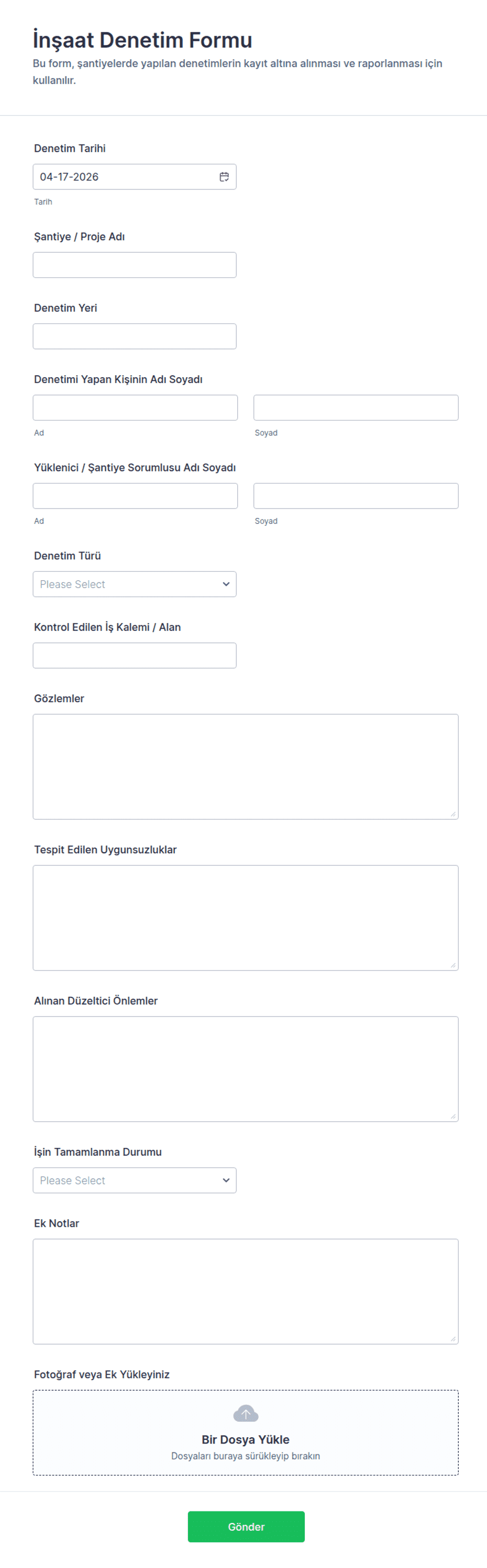 - İnşaat Denetimleri: Fotoğraf yükleme alanları, güvenlik ekipmanı kontrol listeleri ve denetçi onayı için imza alanları gerektirebilir.