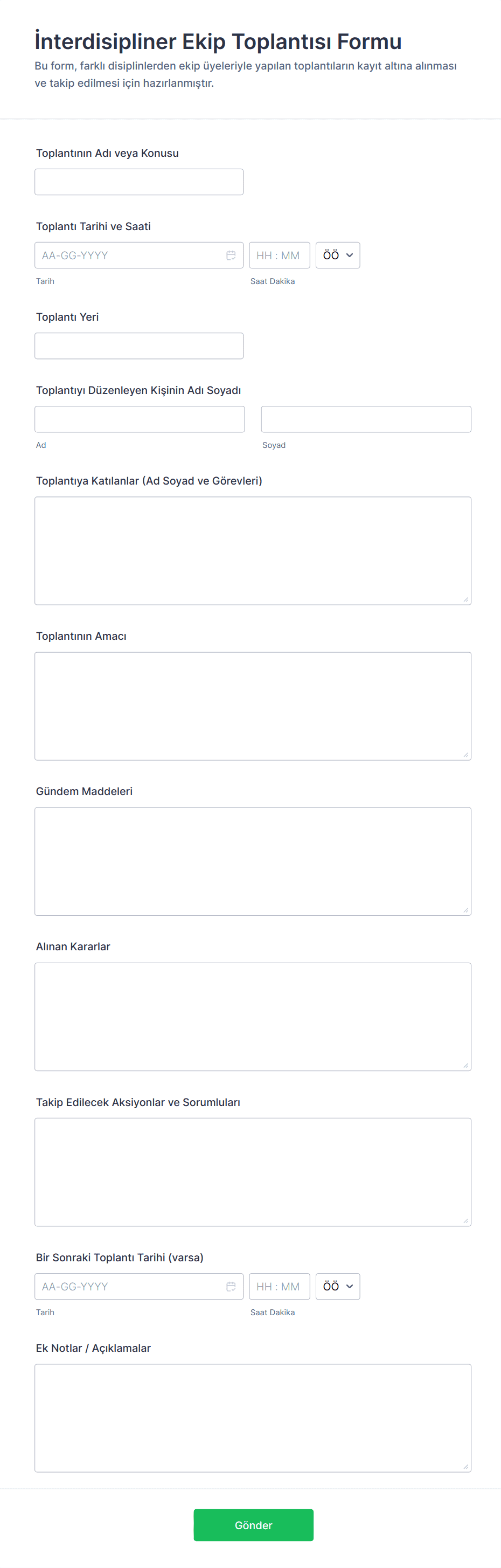 Toplantı formu, katılımcı bilgileri, gündem maddeleri ve geribildirim gibi önemli bilgileri toplayarak toplantıları düzenlemek, planlamak ve yönetmek için kullanılan online bir araçtır.
