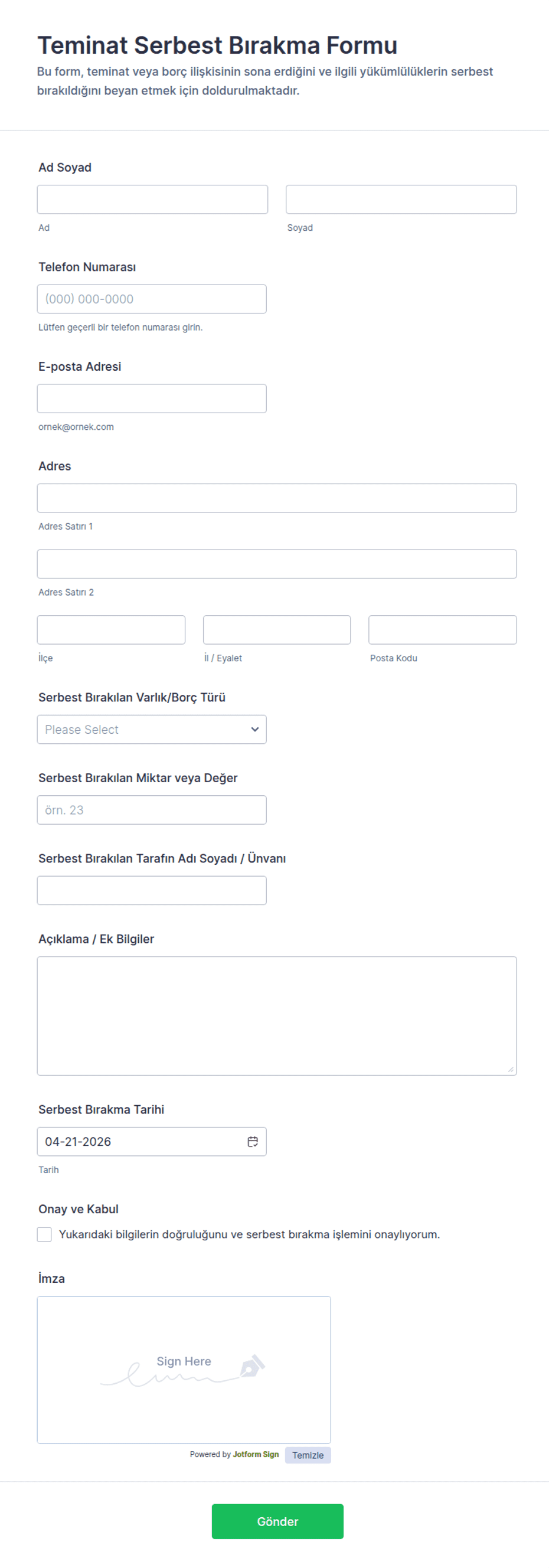 - Gerektiğinde ek alanlar (örn. reşit olmayanlar için ebeveyn/veli bilgileri, feragatnameler için acil durum iletişim bilgileri).