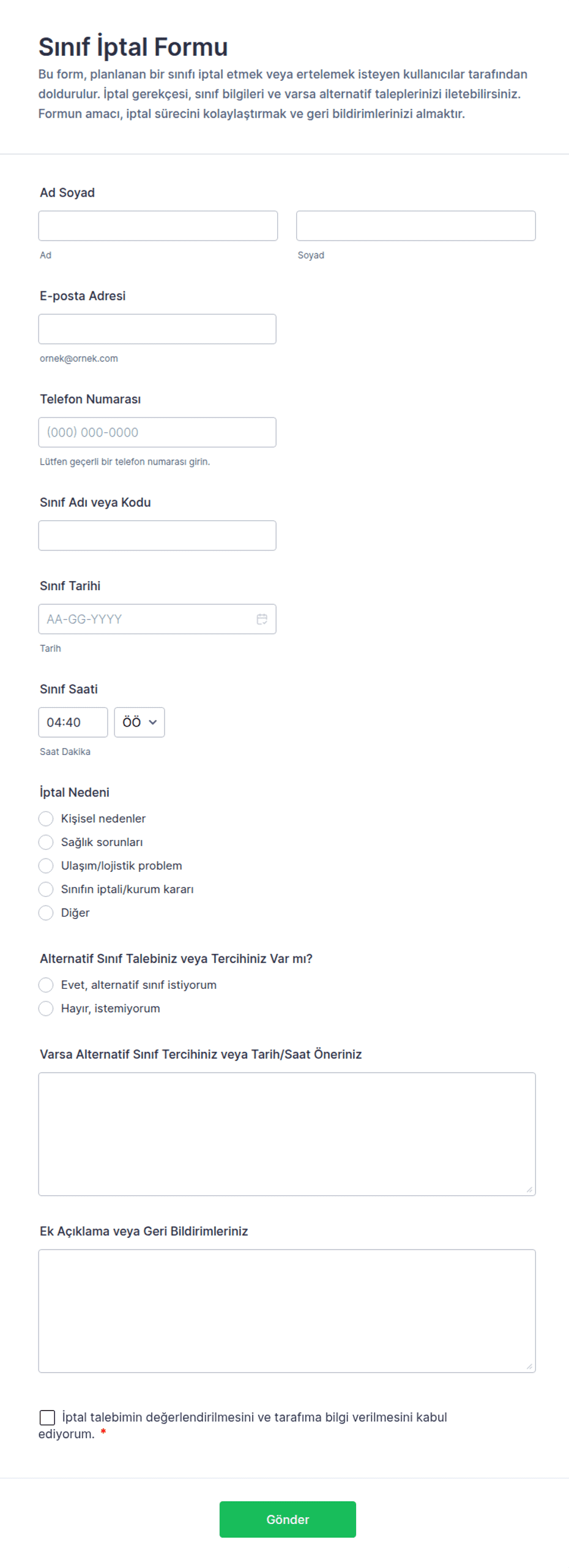 - İçerik ve alanlar kullanım durumuna göre değişir: örneğin, bir spor salonu üyeliği iptali için hesap bilgileri ve geri bildirim gerekebilirken, bir etkinlikten vazgeçmek için kayıt kimliği ve geri ödeme tercihleri gerekebilir.