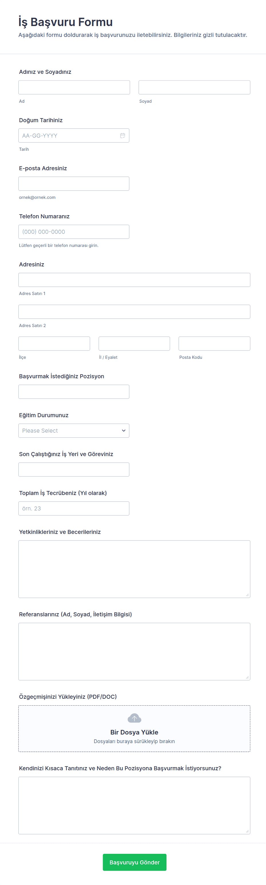 - İş Başvuruları İçin: Ad, iletişim bilgileri, eğitim, iş deneyimi, özgeçmiş yüklemesi, eleme soruları.