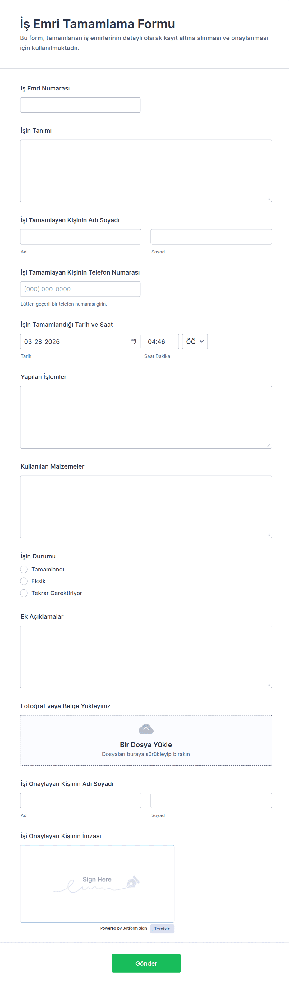 Bakım formu, kiracılar veya bina yöneticileri tarafından bina, mobilya gibi mülkle ilgili bakım talebinde bulunmak için kullanılan bir belgedir. Bakım formları ayrıca bakım ekipleri tarafından bir projenin ilerlemesini takip etmek için de kullanılabilir; böylece bilgi toplamak ve işleri verimli bir şekilde tamamlamak kolaylaşır. Jotform’un ücretsiz Bakım Formu şablonları ile ihtiyaçlarınıza en uygun formu oluşturabilir, özelleştirebilir ve dakikalar içinde paylaşabilir ya da web sitenize yerleştirebilirsiniz. Bakım sürecini daha hızlı ve verimli hale getirebilirsiniz.