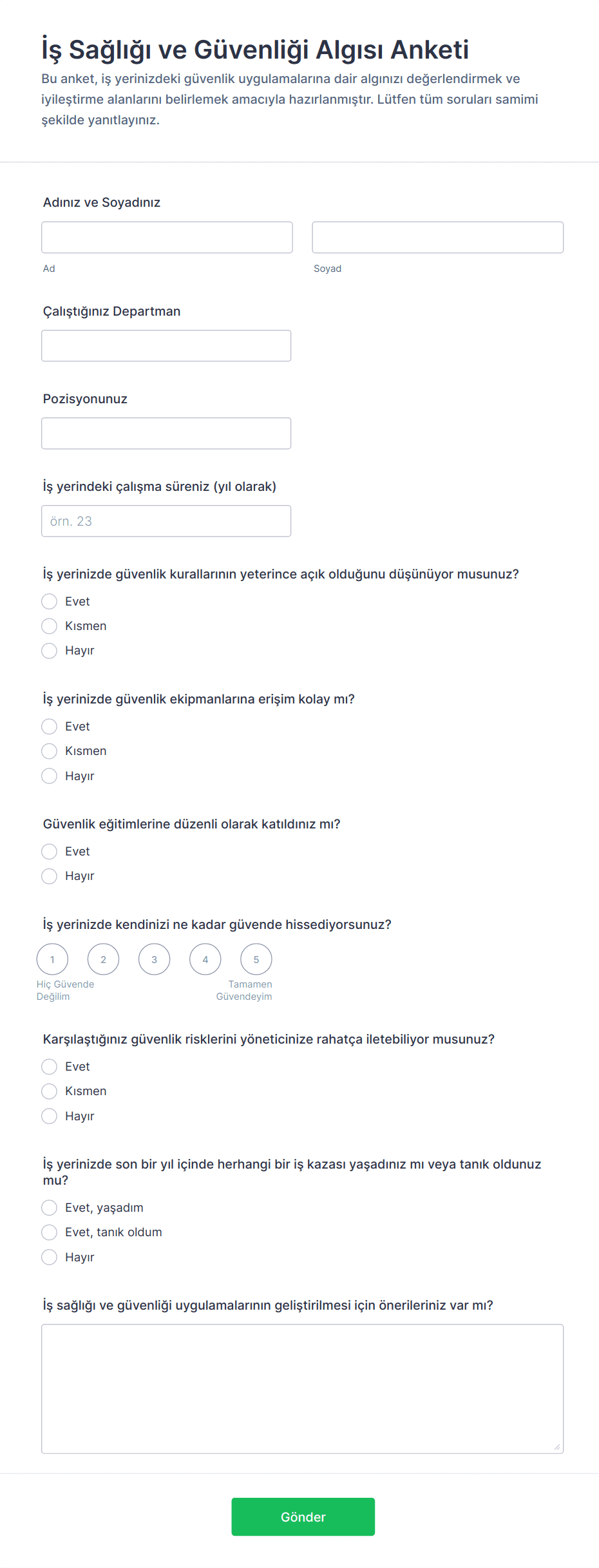 İş Sağlığı ve Güvenliği Algısı Anketi Formu ile çalışanların güvenlik uygulamalarına dair algısını ölçün, iyileştirme alanlarını belirleyin ve Jotform üzerinden veri toplama sürecini tek noktadan yönetin.