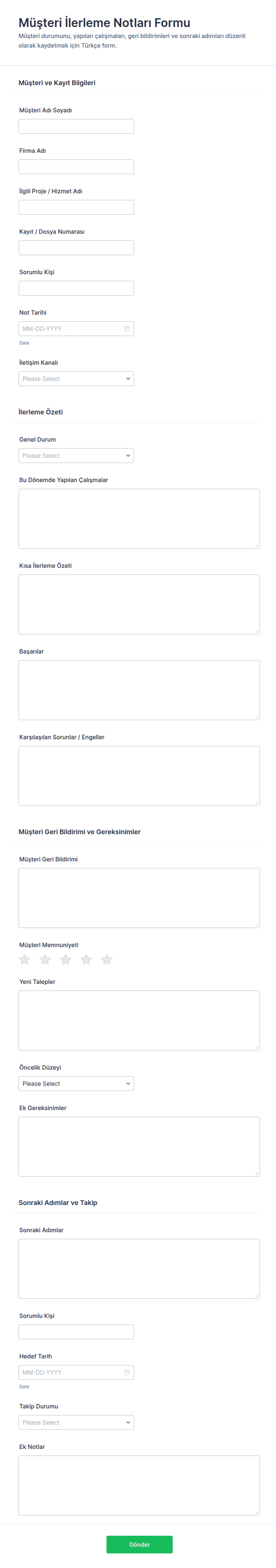 Müşteri İlerleme Notları Formu, projelerde durum güncellemelerini, müşteri geribildirimini ve takip adımlarını tek yerde toplayarak ajanslar, danışmanlar ve müşteri ekiplerinin düzenli veri toplama yapmasına yardımcı olur.