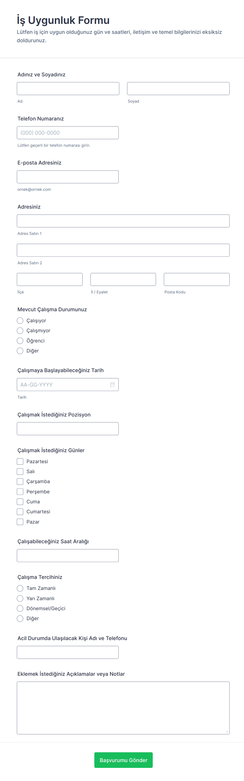 • İş Başvuruları İçin: Ad, iletişim bilgileri, eğitim, iş deneyimi, özgeçmiş yüklemesi, eleme soruları.