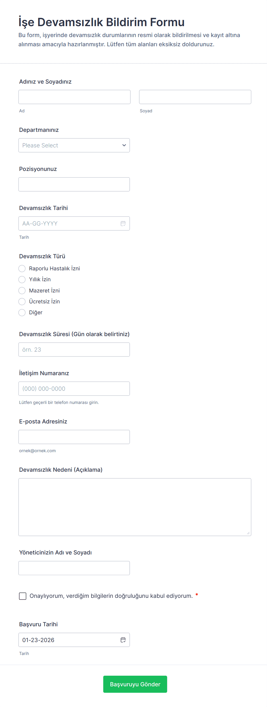 Yoklama Formu Şablonları, çeşitli etkinlikler, aktiviteler ve kuruluşlar için katılımı takip etmek, kaydetmek ve yönetmek amacıyla önceden tasarlanmış dijital formlardır. İster bir sınıf organizasyonu, kurumsal eğitim oturumu, topluluk etkinliği veya gönüllü programı düzenliyor olun, bu şablonlar katılımcı bilgilerini toplama ve mevcudiyeti izleme sürecini kolaylaştırır. Yoklama formları, günlük giriş kayıtları, etkinlik kayıtları, çalışan zaman takibi veya uzaktan katılım doğrulaması için özelleştirilebilir ve bu sayede eğitimciler, İK profesyonelleri, etkinlik koordinatörleri ve takım liderleri için çok yönlü araçlar haline gelir.