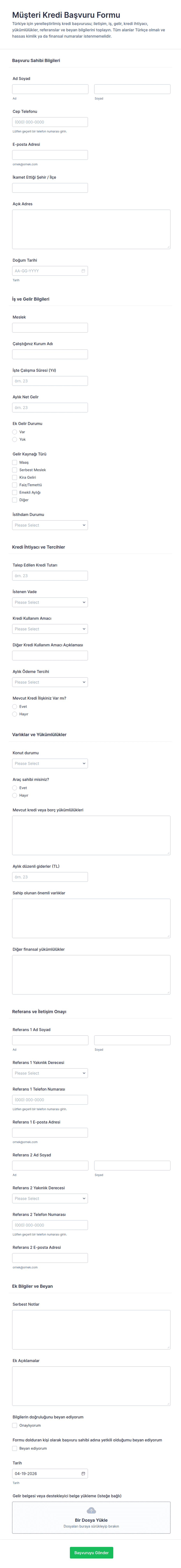Kredi başvuru formları, finansal kurumlar, işletmeler ve hizmet sağlayıcılar tarafından kredi talep eden kişi veya kuruluşlardan detaylı bilgi toplamak için kullanılan önemli araçlardır. Bu formlar genellikle kişisel veya işletme bilgileri, finansal geçmiş, istihdam bilgileri, referanslar ve talep edilen kredi tutarı gibi verileri toplar. Kredi başvuru formları, başvuru sahiplerinin kredi değerliliğini değerlendirmek, onay sürecini hızlandırmak ve yasal gerekliliklere uyumu sağlamak için çok önemlidir. Bankacılık, perakende, otomotiv satışları, emlak kiralamaları ve B2B işlemlerinde yaygın olarak kullanılırlar ve bu da onları kredinin söz konusu olduğu her senaryoda temel bir unsur haline getirir.