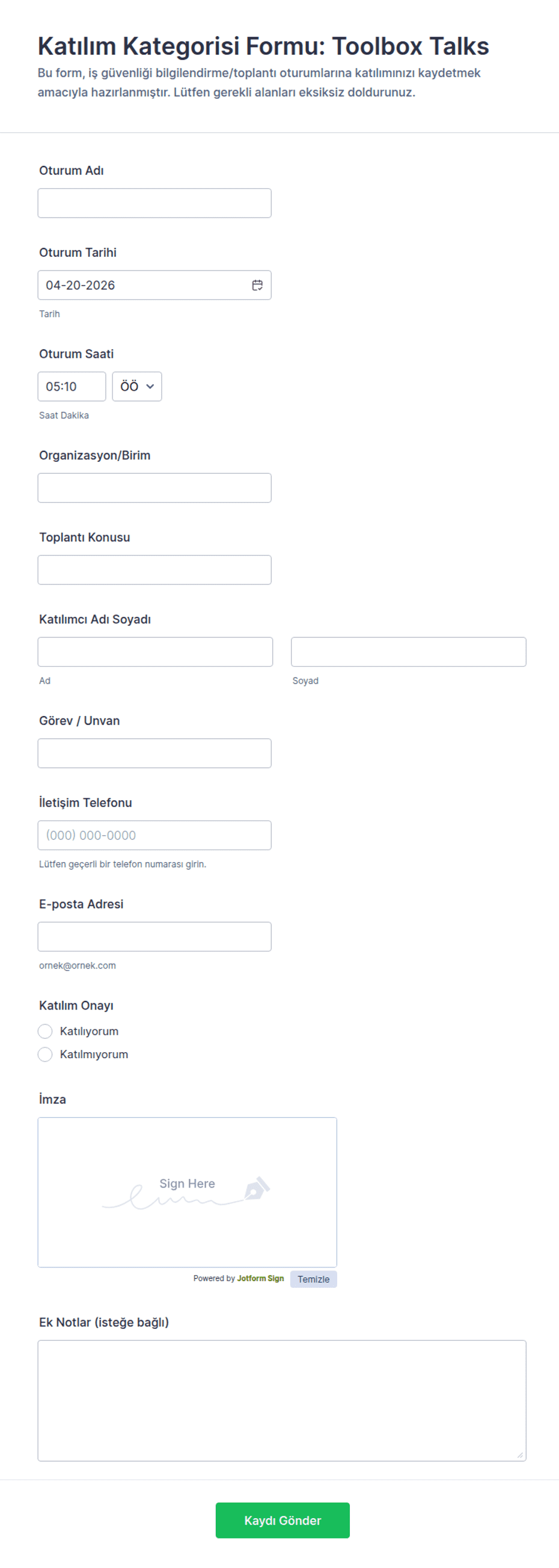 Yoklama Formu ile ad soyad, iletişim bilgileri, kurum, katılımcı türü, geliş tarihi ve imza toplayarak yoklama ve ziyaretçi kayıtlarını Jotform Form Oluşturucu üzerinden kolayca yönetin.