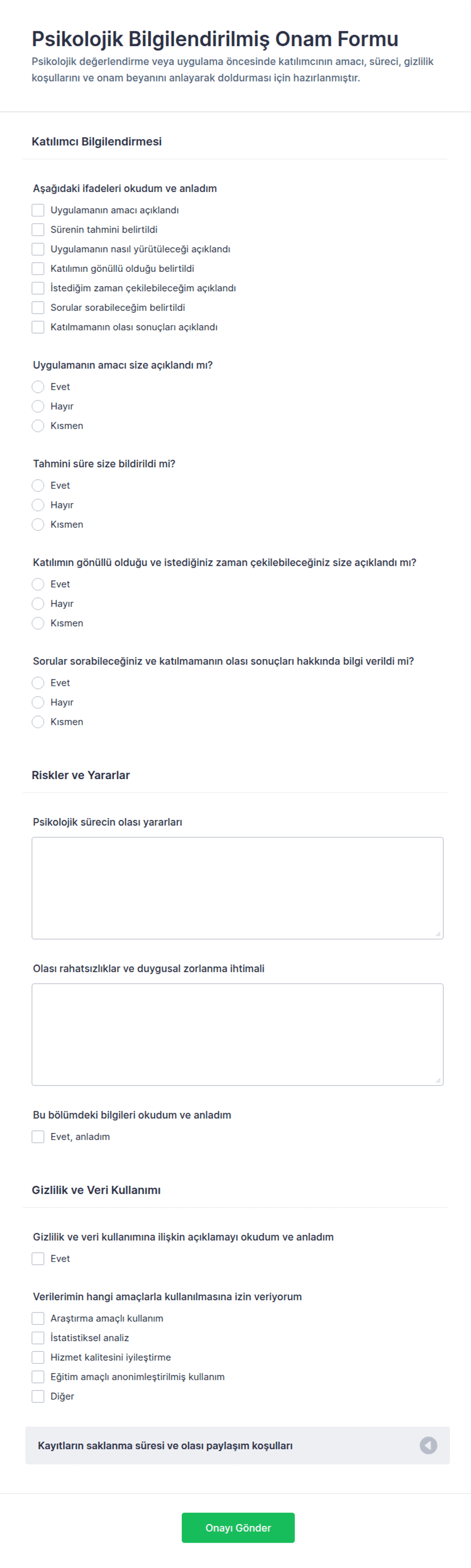 Psikolojik Bilgilendirilmiş Onam Formu ile danışan veya katılımcı bilgilendirmesini dijital ortamda toplayın, onayı güvenle kaydedin ve Jotform üzerinden form yanıtlarını tek yerden yönetin.