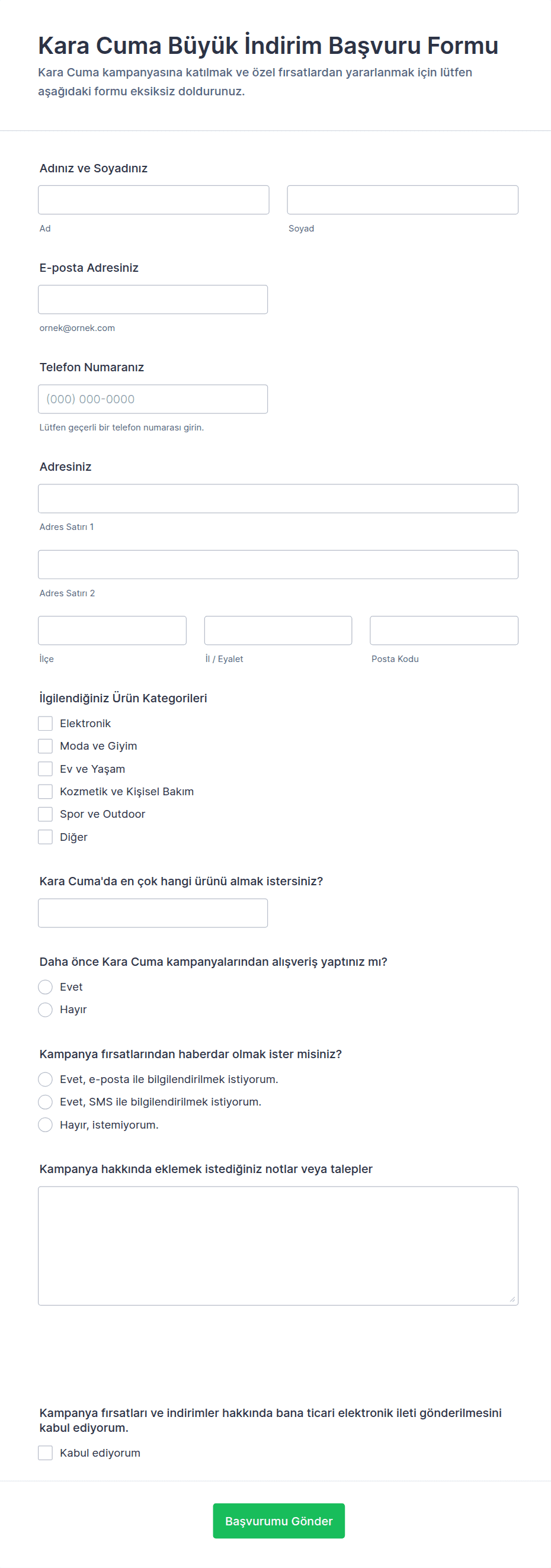 Efsane Cuma Form Şablonları; işletmelerin, perakendecilerin ve kuruluşların Efsane Cuma alışveriş sezonundaki yoğun aktiviteyi verimli bir şekilde yönetmelerine yardımcı olmak için tasarlanmış özel online formlardır. Bu şablonlar, özel fırsatlar için müşteri kayıtlarını toplama, ön siparişleri işleme alma, etkinlik LCV'lerini yönetme, Efsane Cuma promosyonları hakkında geri bildirim toplama veya hatta sınırlı süreli yarışmalar ve çekilişler düzenleme gibi çeşitli amaçlar için kullanılabilir. Veri toplama işlemini kolaylaştıran ve iş akışlarını otomatikleştiren Efsane Cuma Form Şablonları, işletmelerin yüksek hacimli müşteri etkileşimlerini yönetmesine, envanteri takip etmesine ve hem müşteriler hem de personel için sorunsuz bir alışveriş deneyimi sağlamasına yardımcı olur.