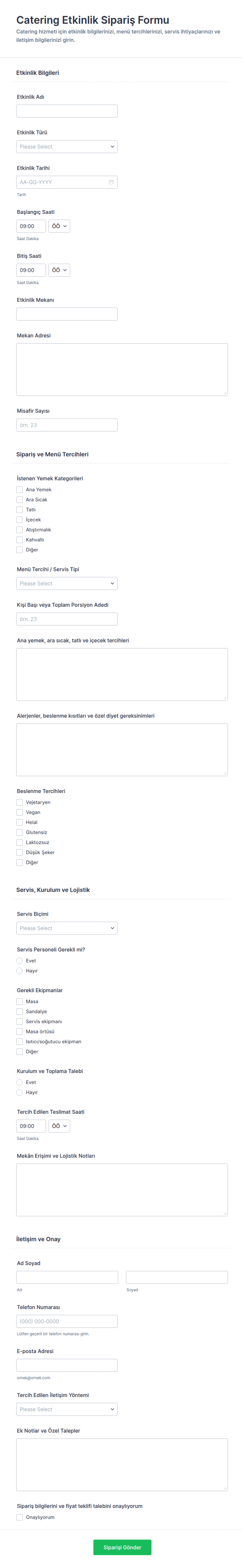 - Düğün yemeği siparişi için etkinlik tarihi, mekan, misafir sayısı, menü seçimleri, diyet kısıtlamaları ve iletişim bilgileri alanlarını ekleyin.