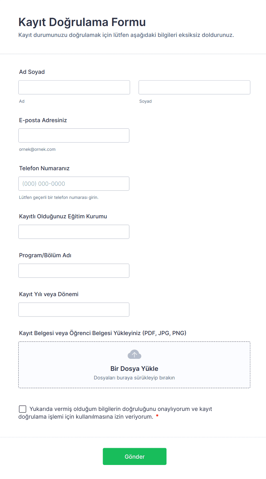 Doğrulama formları, kişiler veya kuruluşlar tarafından sağlanan bilgileri doğrulamak, onaylamak veya teyit etmek için tasarlanmış özel dijital araçlardır. Bu formlar genellikle kimlikleri, yeterlilikleri, istihdam durumunu, adresleri veya diğer kritik veri noktalarını güvenli ve verimli bir şekilde doğrulamak için kullanılır. Tipik kullanım alanları arasında yeni çalışanların işe alımı, öğrenci kaydının onaylanması, finansal hizmetler için müşteri kimliklerinin doğrulanması veya uyumluluk süreçlerinde gönderilen belgelerin doğruluğunun sağlanması yer alır. Doğrulama sürecini kolaylaştıran bu formlar, kuruluşların dolandırıcılığı azaltmasına, yasal uyumluluğu sürdürmesine ve paydaşlarıyla güven oluşturmasına yardımcı olur.