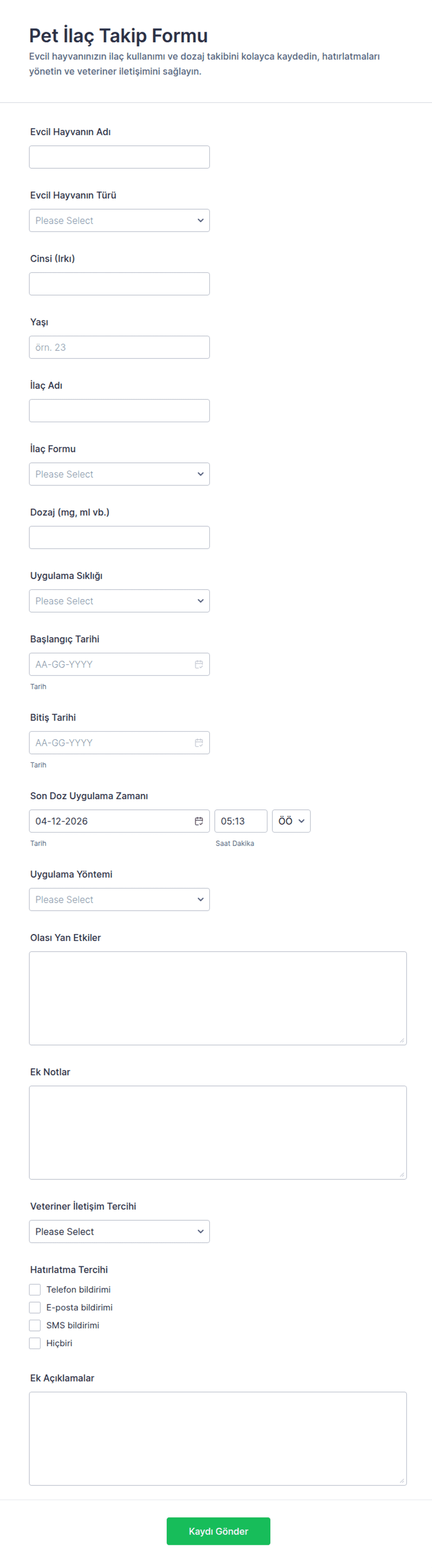 - İlaç kayıtları, ilaç adları, dozaj ve zamanlar için alanlar gerektirir