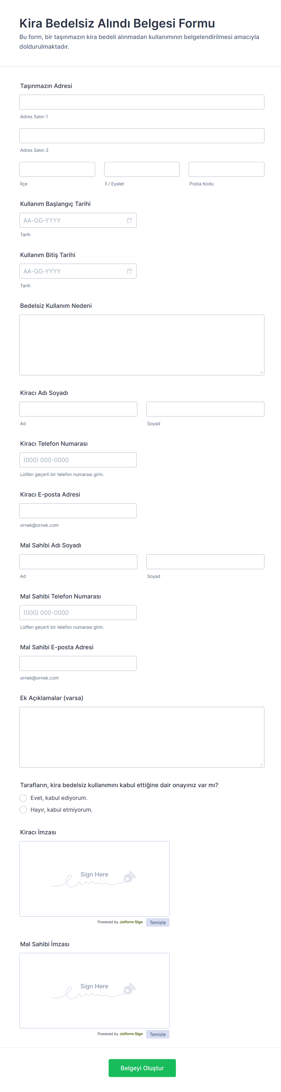 Jotform ile kullanıcılar, hiçbir kod yazmadan mülk yönetimi formlarını online olarak kolayca oluşturabilir, özelleştirebilir ve yönetebilir. Jotform'un kullanımı kolay sürükle-bırak Form Oluşturucu'su, kapsamlı şablon kütüphanesi ve güçlü entegrasyonları, emlak profesyonellerinin sorunsuz bir şekilde veri toplamasına ve düzenlemesine olanak tanır. Kullanıcılar bildirimleri otomatikleştirip, online ödemeler kabul edebilir ve yanıtları güvenli bir şekilde depolayabilir; bu da kiracı işe alımdan bakım takibine kadar her şeyi yönetmeyi kolaylaştırır. Mülk yönetimi iş akışlarını Jotform ile dijitalleştirerek kullanıcılar zamandan tasarruf eder, kağıt işlerini en aza indirir ve hem emlak yöneticileri hem de kiracılar için genel deneyimi iyileştirir.