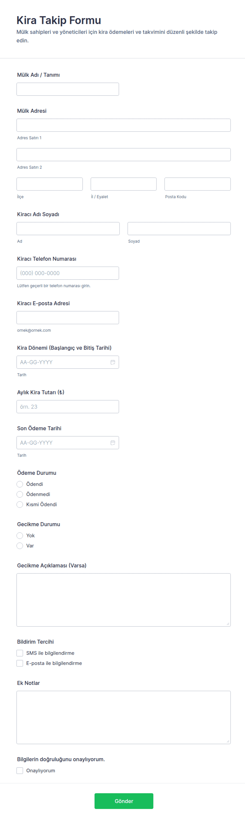 Kira Takip Formu, mülk sahipleri ve emlak yönetimi yapanlar için kira ödemelerini düzenli veri toplama ile izlemeyi kolaylaştıran bir form şablonudur.