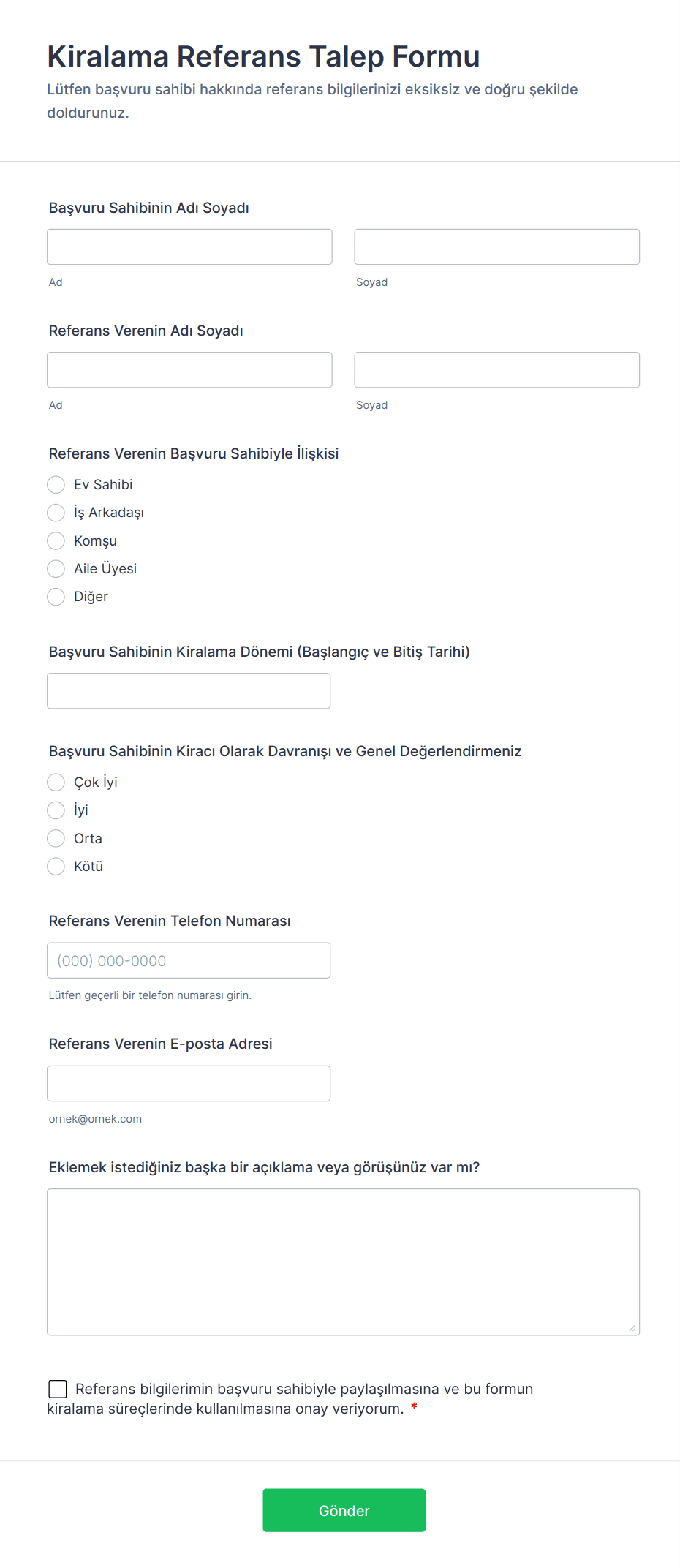 Aday adı, başvurulan rol veya program ve referans verenin adı, unvanı ve adayla ilişkisi için alanlar ekleyin.