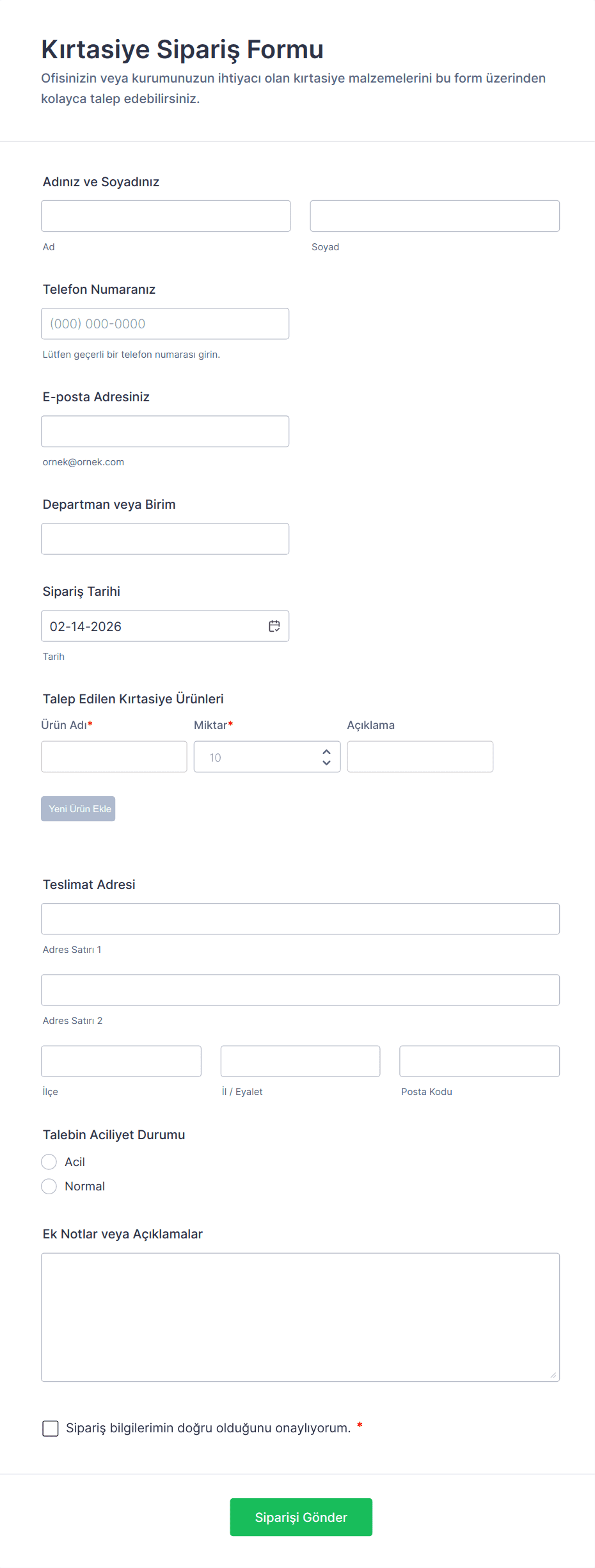 Jotform ile malzeme sipariş formu oluşturmak, kuruluşunuzun özel ihtiyaçlarına göre uyarlanabilen basit bir süreçtir. Ofis malzemeleri, tıbbi ekipman veya etkinlik materyalleri yönetiyor olun, Jotform'un esnek platformu, tedarik sürecini kolaylaştıran ve kayıt tutmayı iyileştiren formlar tasarlamanıza olanak tanır.