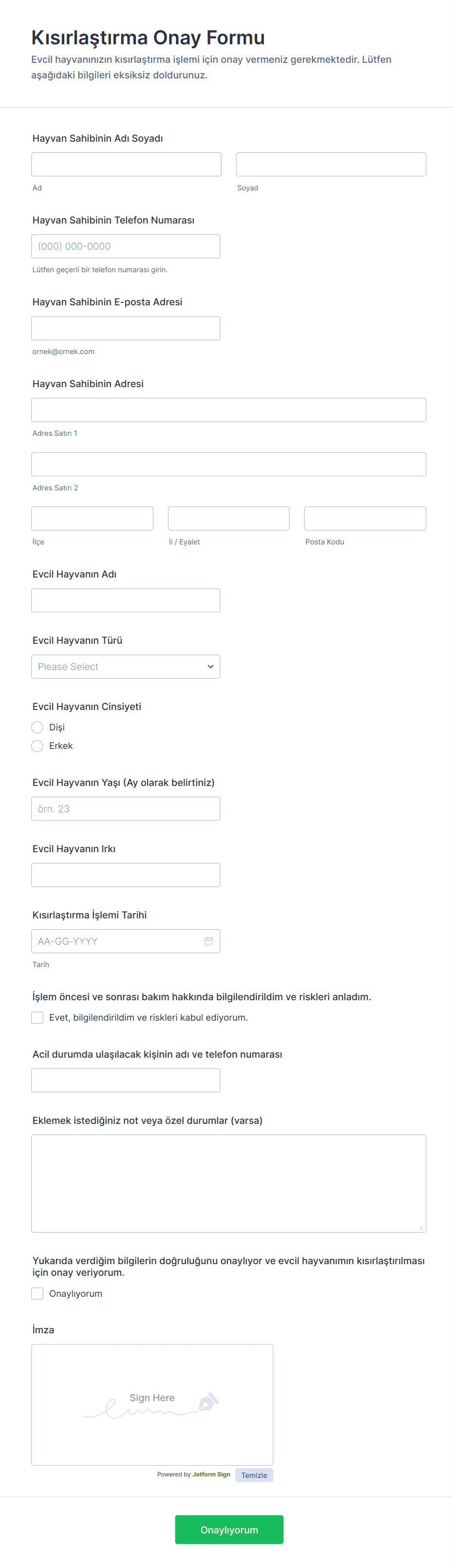 Jotform ile onay formları oluşturmak ve yönetmek sorunsuz bir süreç haline gelir. Jotform'un kodlama gerektirmeyen Form Oluşturucu'su, kullanıcıların hasta kabulü, ebeveyn izinleri veya veri işleme sözleşmeleri gibi özel ihtiyaçlarına yönelik onay formlarını hızlıca tasarlamalarına olanak tanır. Sürükle-bırak arayüzü, özelleştirilebilir şablonlar ve güvenli depolama ve bildirim sistemleriyle entegrasyon, onay yanıtlarını toplamayı, düzenlemeyi ve erişmeyi kolaylaştırır. Kullanıcılar, Jotform'un gelişmiş özelliklerini kullanarak uyumluluğu sağlayabilir, iş akışlarını düzenleyebilir ve hem kuruluşlar hem de yanıtlayanlar için profesyonel bir deneyim sunabilir.