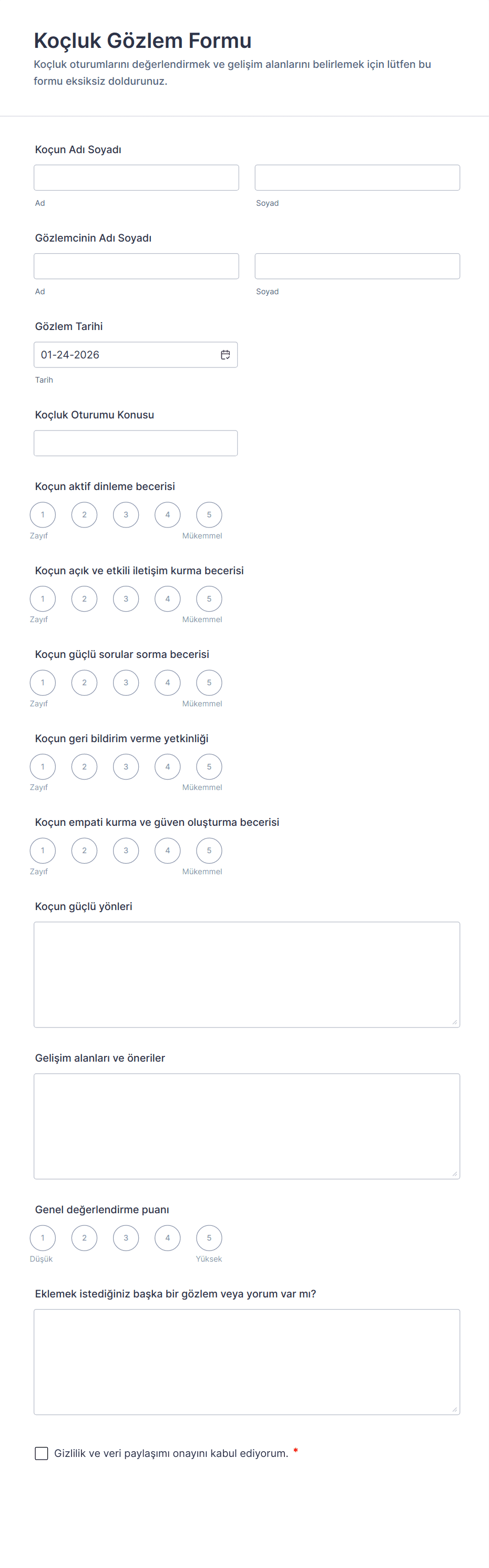 Koçluk Gözlem Formu, koçluk oturumlarını puanlama ve geri bildirimle değerlendirme sürecini Jotform üzerinden dijitalleştirmek isteyen kurumlar, koçluk okulları ve bağımsız koçlar için uygundur.