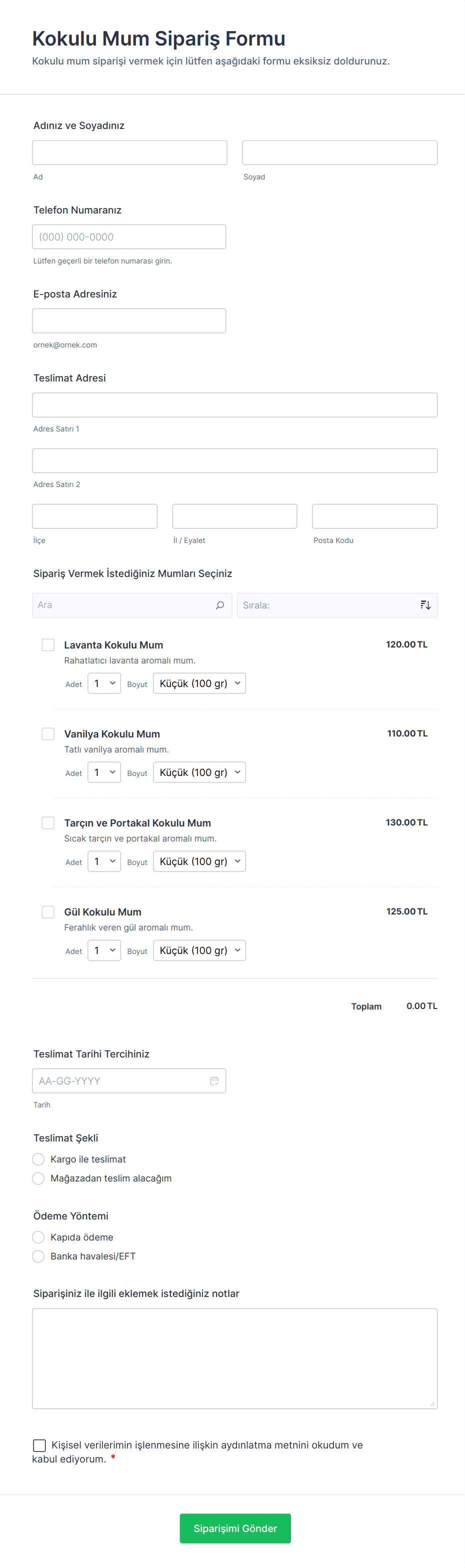 Müşterilerinizin kolaylıkla online sipariş vermelerini sağlayan, temel iletişim bilgileri, ürün detayı ve teslimat adresi bilgilerini toplayan form örneği.