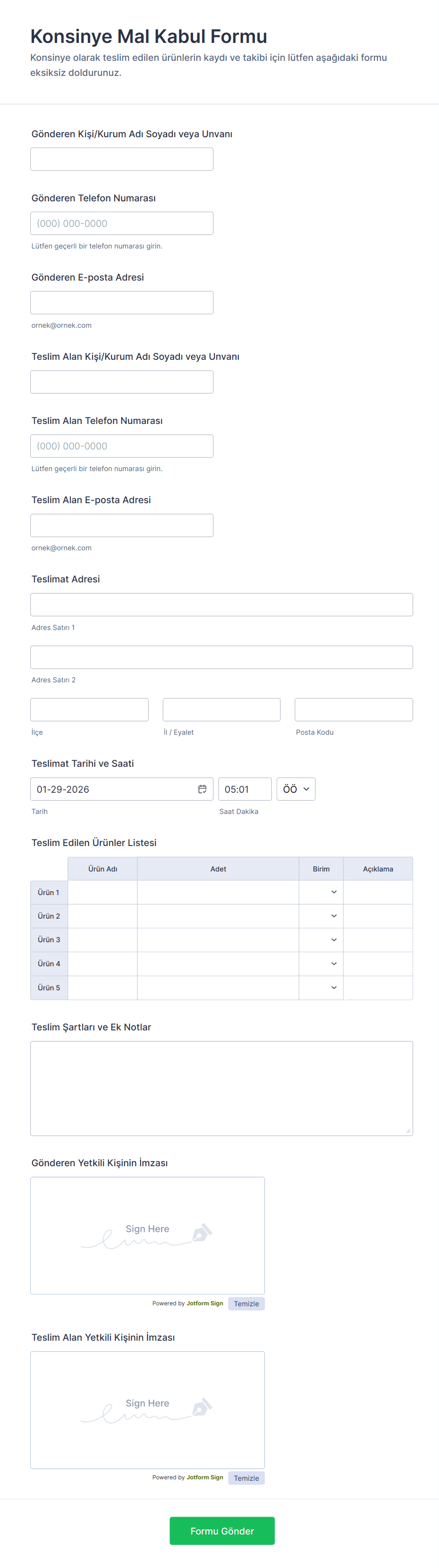 - Teslimat kanıtı için dijital imza ve tarih alanları