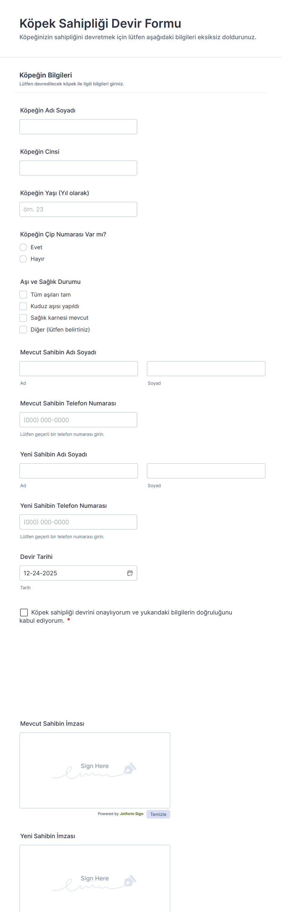 Jotform ile Evcil Hayvan Sahiplendirme Başvuru Formu oluşturmak, başarılı ve sorumlu evcil hayvan yerleştirmelerini sağlamak için gerekli tüm bilgileri toplamanıza olanak tanıyan basit bir süreçtir. İster standart bir sahiplendirme formu, ister geçici bakım başvurusu, ister gönüllü kaydı oluşturuyor olun, Jotform'un esnek platformu formlarınızı tasarlamanızı, özelleştirmenizi ve yönetmenizi kolaylaştırır.