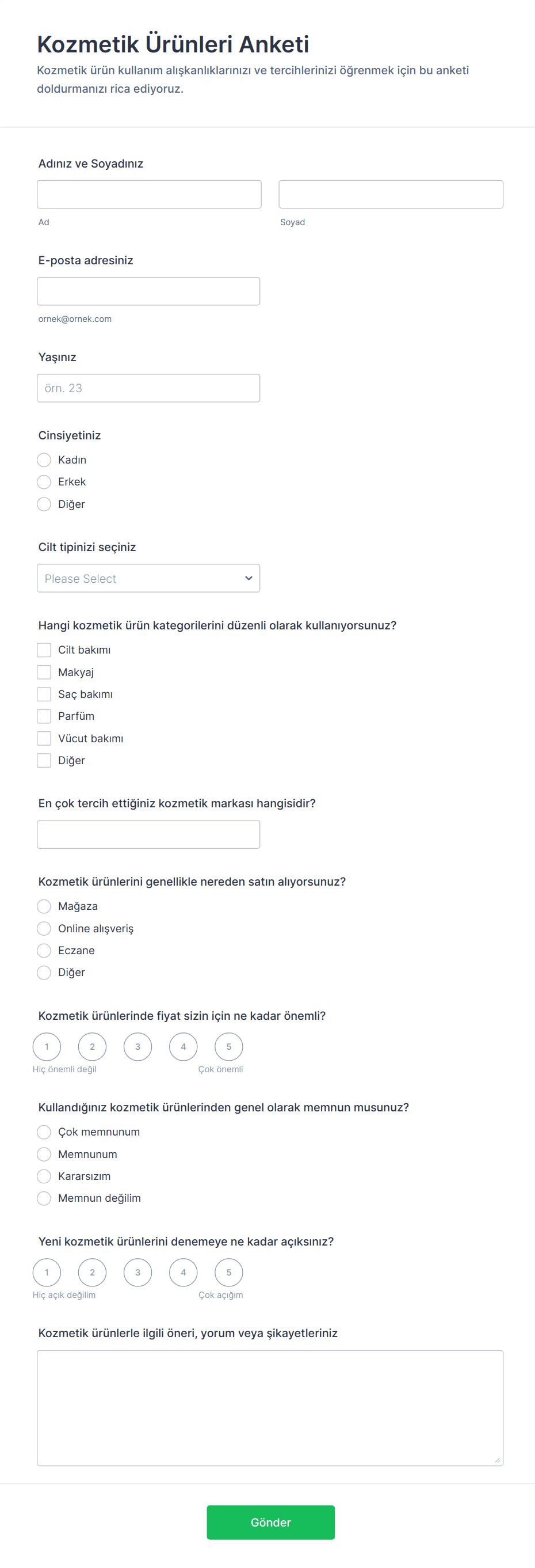 - İçerik ve alanlar kullanım durumuna göre değişir: konsept testleri beklentilere ve ilk izlenimlere odaklanırken, satın alma sonrası anketler memnuniyet ve ürün performansını vurgular.