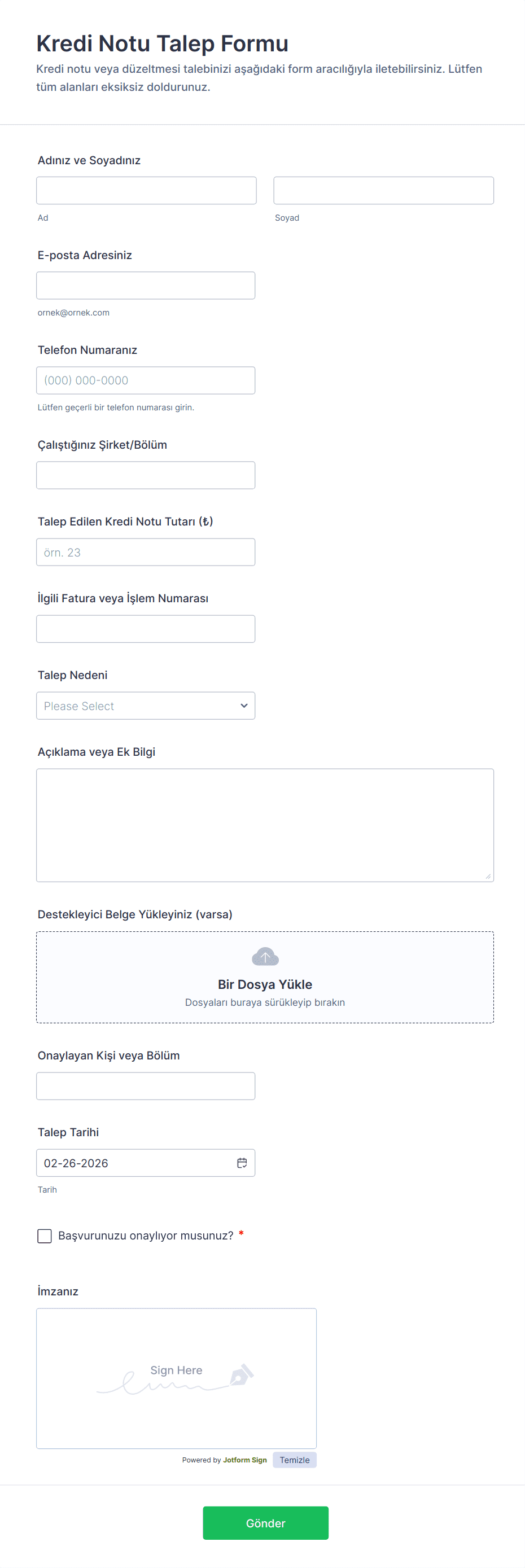 Düzeltme Talebi Form Şablonları, bir kuruluş içindeki değişiklik, düzeltme veya düzenleme taleplerini kolaylaştırmak için tasarlanmış özel dijital formlardır. Bu formlar, maaş düzeltmeleri, program değişiklikleri, not düzeltmeleri, envanter güncellemeleri veya politika değişiklikleri gibi çeşitli amaçlar için yaygın olarak kullanılır. Düzeltme taleplerini göndermenin ve takip etmenin standart bir yolunu sunarak, bu şablonlar gerekli tüm bilgilerin baştan toplanmasını sağlar, hataları ve gecikmeleri azaltır. İster çalışan taleplerini, ister öğrenci kayıtlarını veya operasyonel değişiklikleri yönetiyor olun, Düzeltme Talebi Form Şablonları, değişiklikleri verimli bir şekilde ele almak için güvenilir bir çözüm sunar.