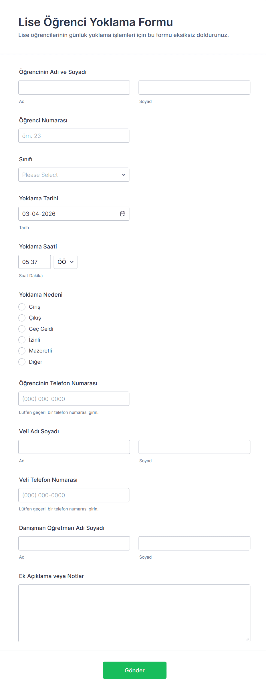 - Özel Alanlar: Öğrenci/çalışan kimlik numarası, departman/sınıf, devamsızlık nedeni veya oturum seçimi.