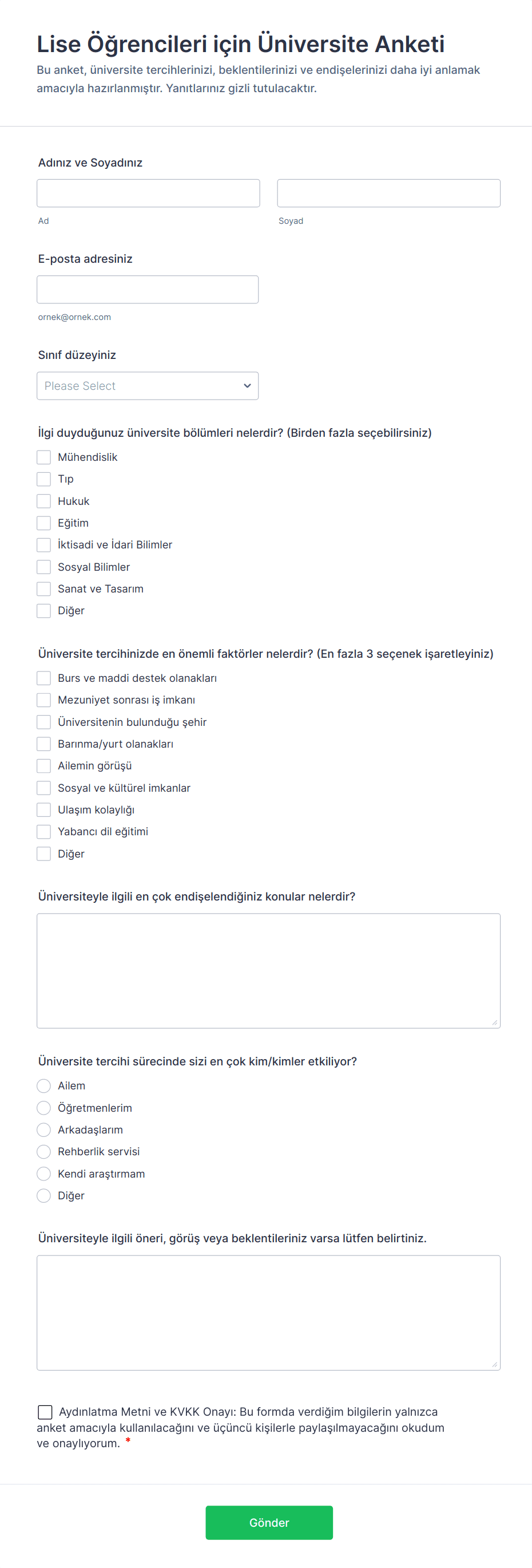 - Öğretmen veya personel anketleri için: Öz değerlendirme alanları, iş arkadaşı değerlendirme bölümleri ve açık uçlu yanıt seçenekleri ekleyin.