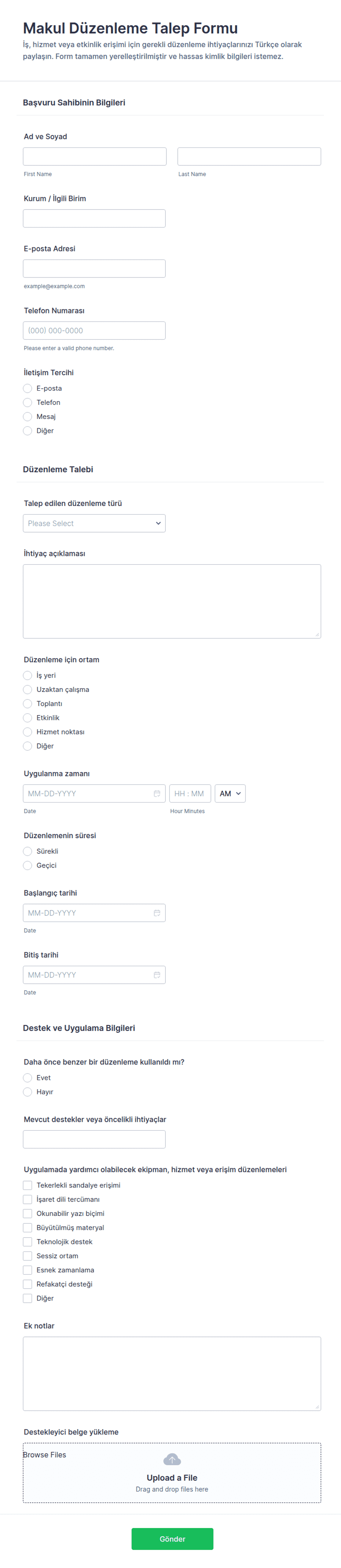- Kullanıcı yanıtlarına göre alanları göstermek veya gizlemek için koşullu mantık kullanın (örneğin, yalnızca belirli bir düzenleme türü seçildiğinde "Destekleyici Belgeler"i görüntüleyin).