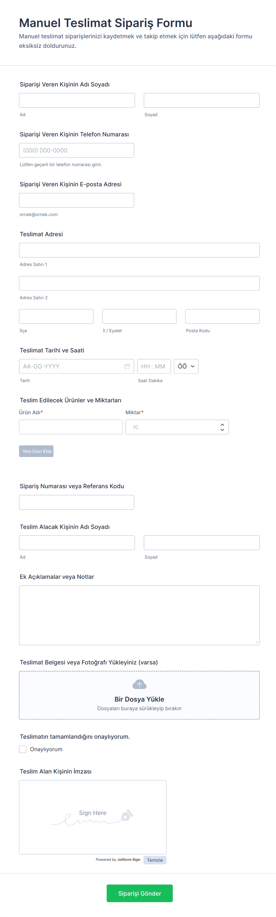 - E-ticaret teslimat formları genellikle sipariş numaraları, takip numaraları ve ödeme onay alanları gerektirir.