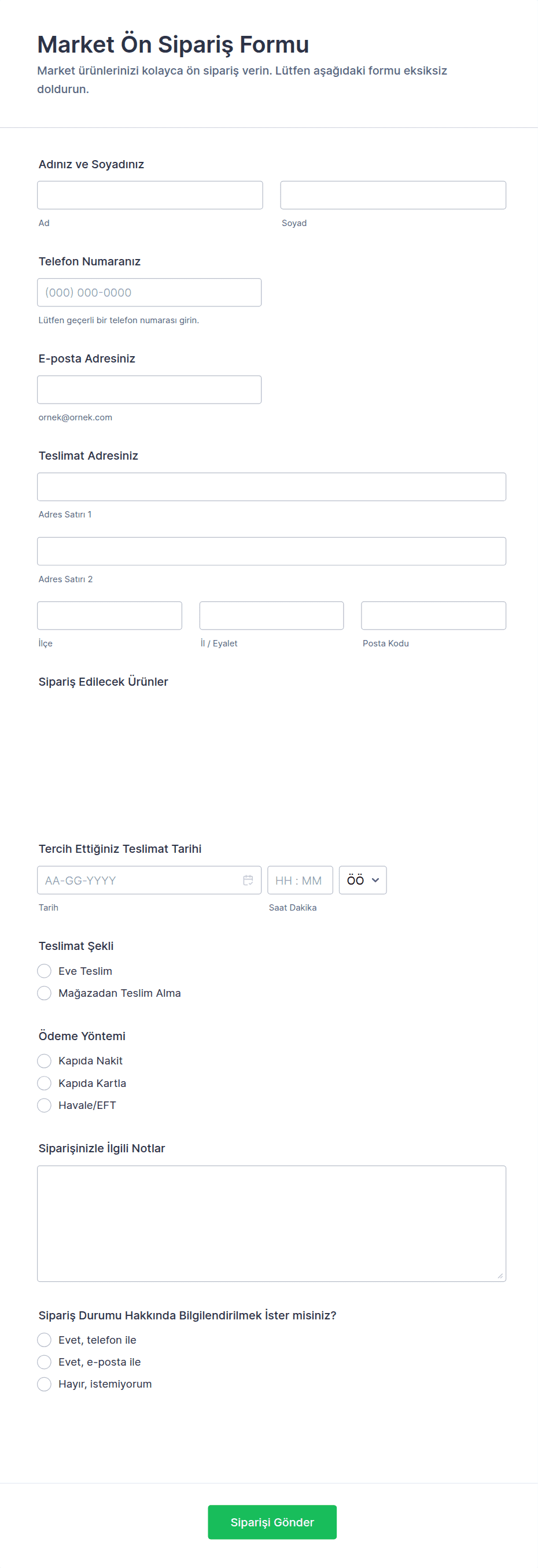 Temel alanlar arasında ürün detayları, miktar, müşteri iletişim bilgileri, ödeme seçenekleri, teslimat veya teslim alma tercihleri ve özel talimatlar bulunur.
