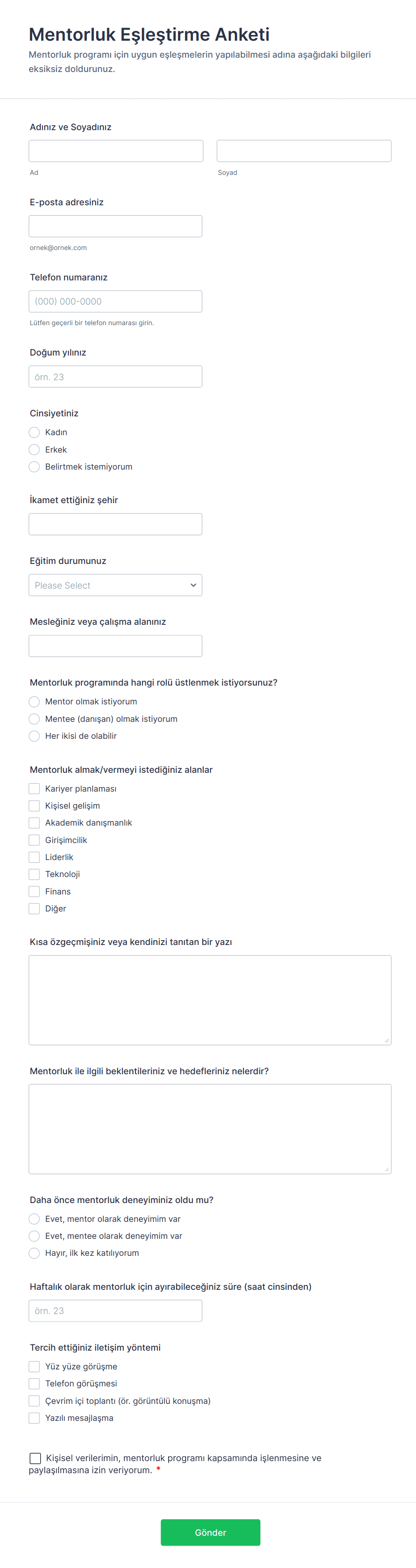 - Akademik araştırmalar için Likert ölçekleri ve demografik soruları kullanın.