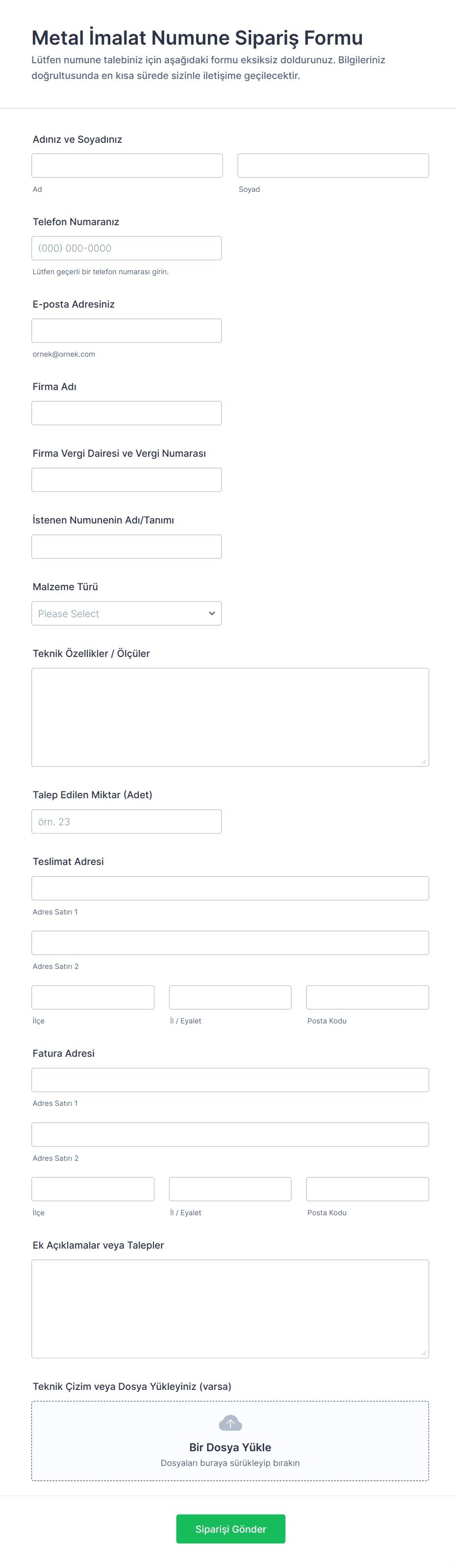 Üretim formları, ürün ve tedarik siparişleri, envanter raporları, geri bildirimler, başvurular ve daha fazlası gibi üretim bilgilerini toplamak amacıyla kullanılan online formlardır. Jotform'un bu kullanıma hazır Üretim Formlarıyla, dağınık kâğıt formlarını bir kenara bırakıp herhangi bir cihazdan doldurabileceğiniz verimli formlara geçiş yaparak zamandan ve kâğıt tüketiminden tasarruf edebilirsiniz.