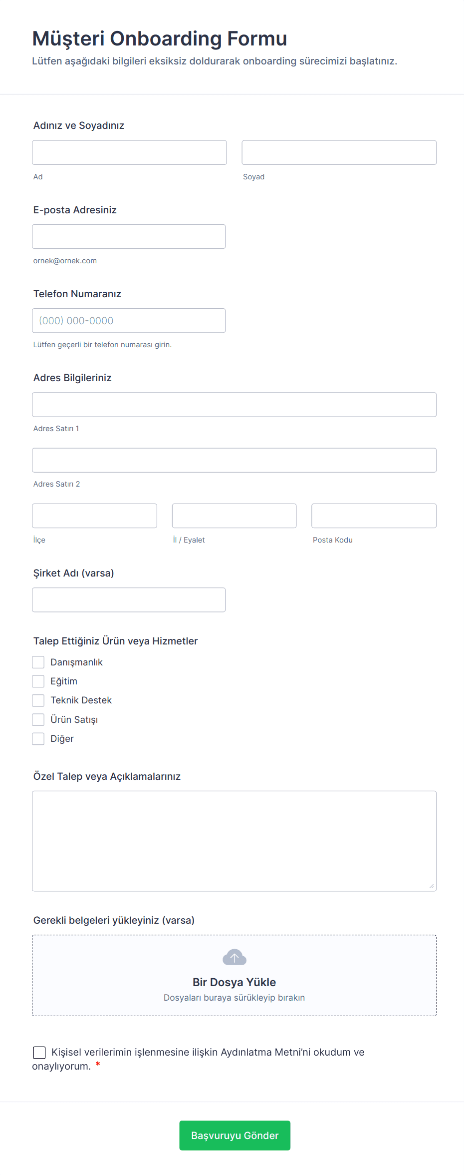 - Çalışan işe alımı: Kişisel bilgiler, vergi formları, acil durum iletişim bilgileri ve politika onayları için alanlar gerektirebilir.