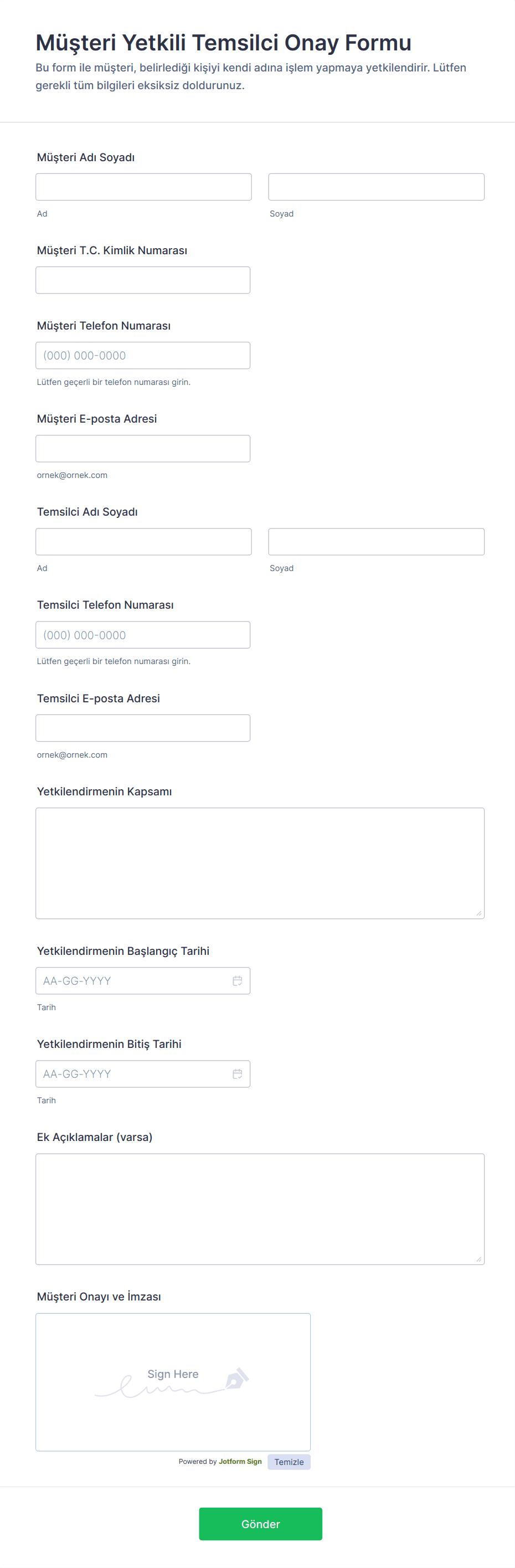 Yaygın alanlar arasında yetkilendiren tarafın adı ve iletişim bilgileri, yetkilendirilen işlemin açıklaması, onayın süresi ve imza veya dijital onay bulunur.