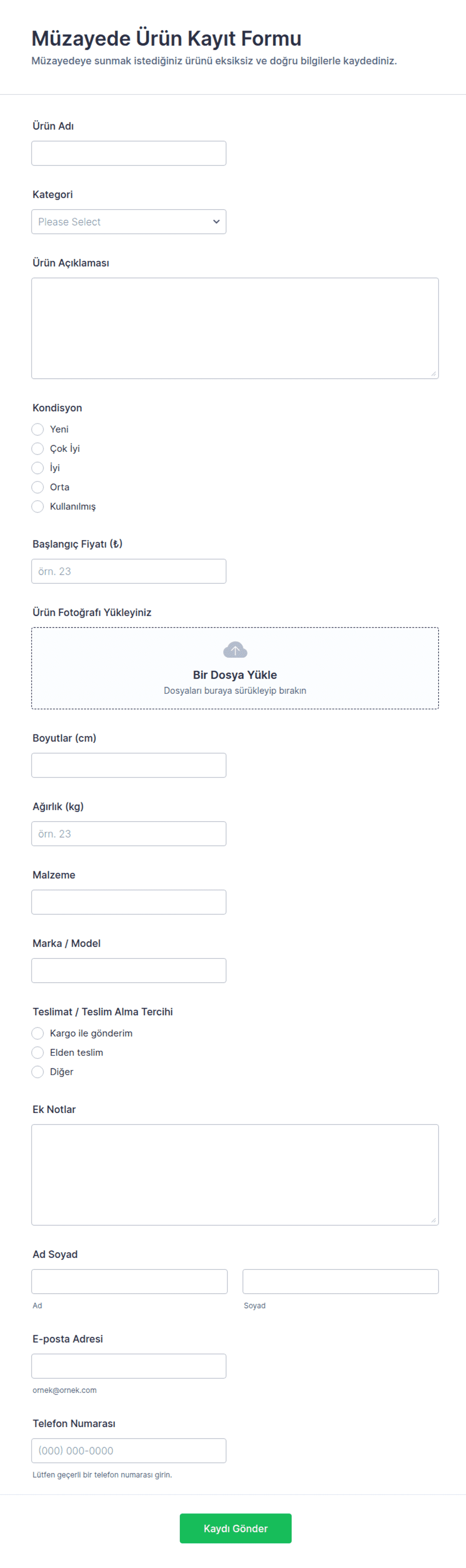 Kullanıcının temel iletişim bilgilerini alarak dosya yüklemelerini sağlayan, bir çok farklı alanda faydalı olabilecek bir form örneği.