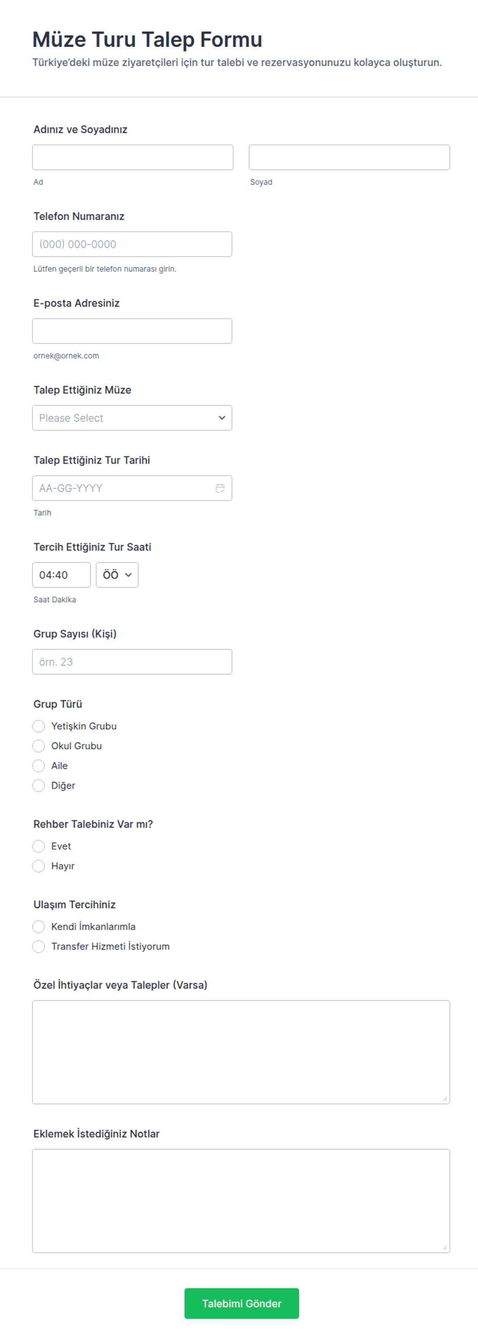 Tur Randevu Formu Şablonları, çeşitli sektörler için tur randevularını planlamayı ve yönetmeyi kolaylaştırmak üzere tasarlanmış özel online formlardır. Rehberli müze ziyaretleri, gayrimenkul gösterimleri, kampüs turları, seyahat gezileri veya fabrika gezileri düzenliyor olun, bu şablonlar katılımcılardan tercih edilen tarihler, grup büyüklükleri, iletişim bilgileri ve özel gereksinimler gibi temel bilgileri toplamanıza yardımcı olur. Standart bir form kullanarak, tur organizatörleri programları verimli bir şekilde koordine edebilir, çift rezervasyonları en aza indirebilir ve hem personel hem de katılımcılar için sorunsuz bir deneyim sağlayabilir.