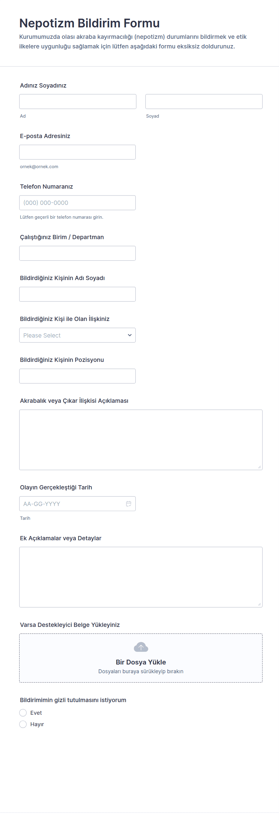 Jotform'un ücretsiz şablonlarından birini kullanarak dakikalar içinde bir İK formu oluşturabilirsiniz! Şablon rehberimize gidin ve ihtiyaçlarınıza en uygun şablonu seçin. Şablonu kullanımı kolay online form oluşturucumuzda özelleştirmeyi tamamladığınızda anında doldurabilmeleri için çalışanlarınızla e-posta, bağlantı veya QR kodu aracılığıyla paylaşabilirsiniz.