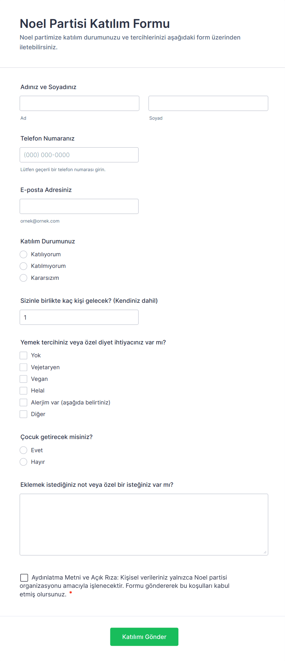 Noel Formları; etkinlik planlamasından hediye alışverişine, gönüllü kayıtlarından eğlenceli anketlere kadar çeşitli tatil etkinliklerini kolaylaştırmak ve geliştirmek için tasarlanmış online formlardır. Bu formlar, Noel partileri düzenlemek, LCV'leri toplamak, Sürpriz Noel Baba programlarını yönetmek, istek listelerini toplamak veya tatil sezonunda yardım organizasyonlarını koordine etmek isteyen bireyler, kuruluşlar, okullar ve işletmeler için mükemmeldir. Bu süreçleri dijitalleştirerek, Noel Formları kağıt işlerini azaltır, karışıklığı en aza indirir ve tüm detayların verimli ve doğru bir şekilde toplanmasını sağlar.