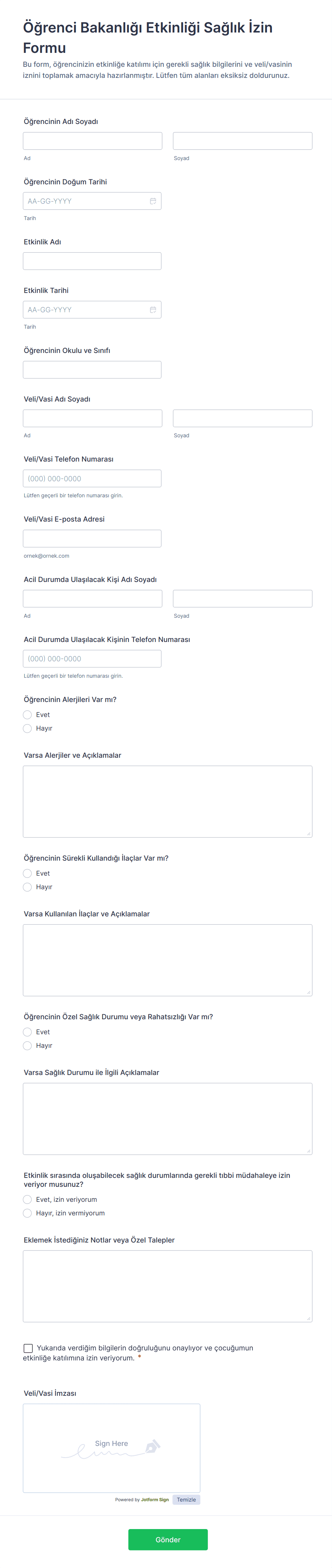 - Eğitim: Okul gezileri, medya izni veya özel etkinlikler için ebeveyn onayı.