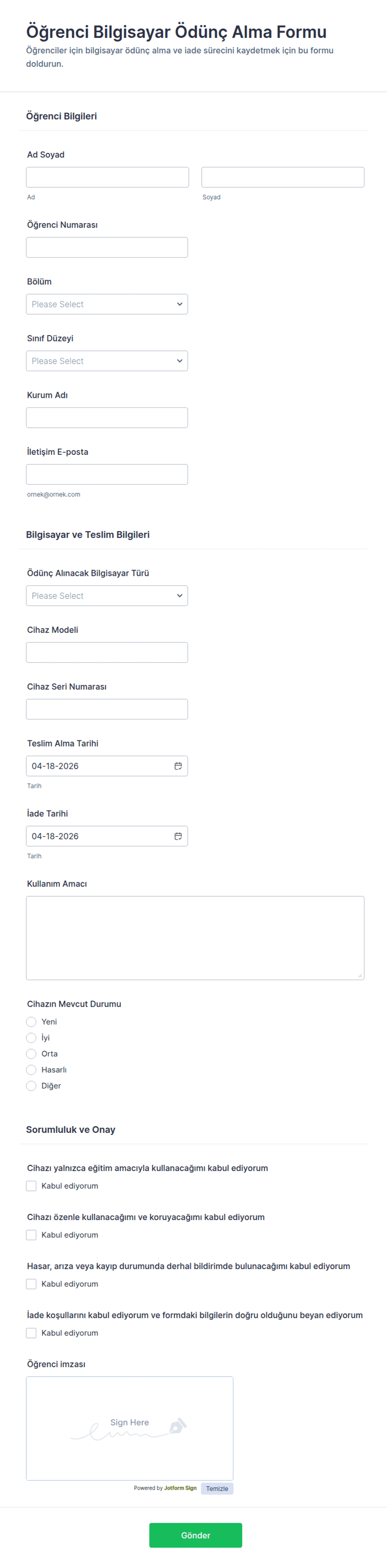 Bilgisayar Teslim Alma Formu, cihaz teslim süreçlerini kayıt altına almak isteyen bilgi işlem ekipleri, teknik servisler ve işletmeler için veri toplama ve takip sürecini Jotform üzerinden kolaylaştırır.