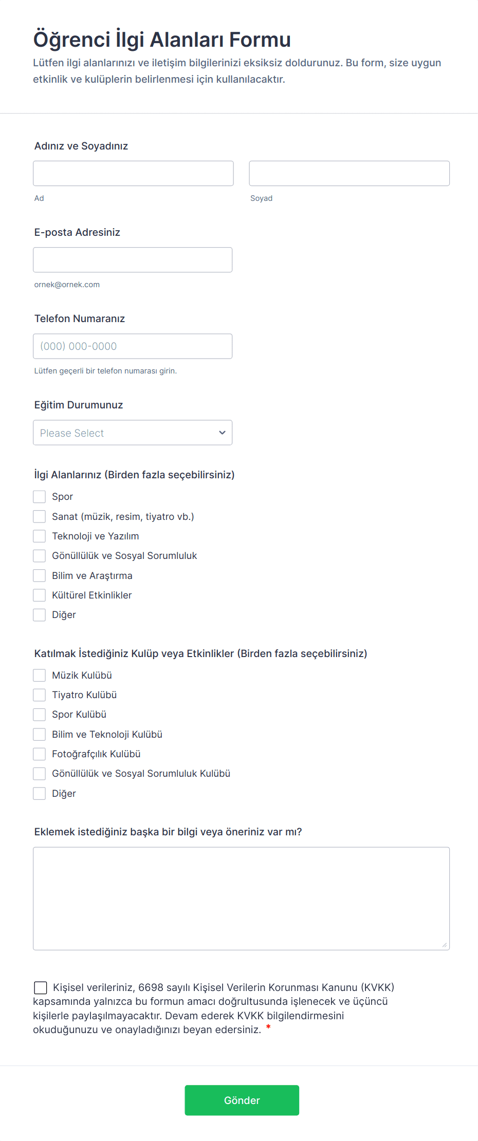 Öğrenci İlgi Alanları Formu, öğrencilerin ilgi alanlarını, kulüp ve etkinlik tercihlerini ve temel iletişim bilgilerini tek bir yerden toplamak için kullanılır. Böylece kurumlar, öğrencilere uygun kulüpler, atölyeler ve etkinlikler planlayabilir.