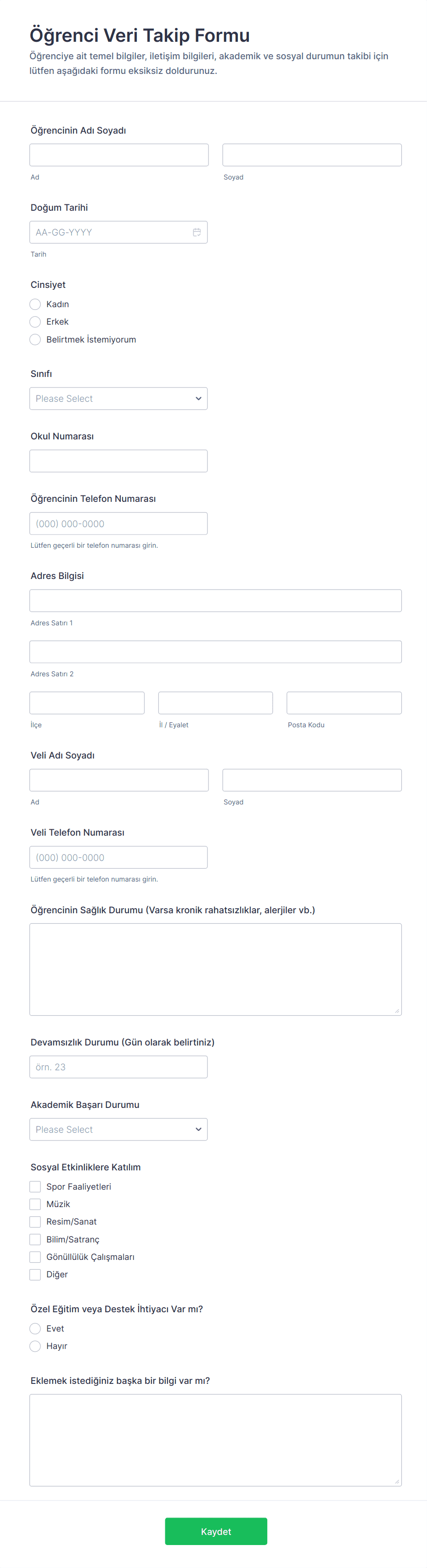 Takip formları, kişilerin ve kuruluşların zaman içinde çeşitli türdeki verileri izlemesine, kaydetmesine ve yönetmesine yardımcı olmak için tasarlanmış özel dijital araçlardır. Bu formlar, envanter takibi, çalışan devam durumu, proje ilerlemesi, giderler, sevkiyatlar, bakım programları ve daha fazlası gibi çok çeşitli amaçlar için kullanılabilir. Bilgileri yakalama ve düzenleme için yapılandırılmış bir yol sağlayarak, takip formları veri toplama işlemini kolaylaştırır ve eğilimleri analiz etmeyi, sorunları belirlemeyi ve hesap verebilirliği sağlamayı daha kolay hale getirir. İster müşteri adaylarını takip eden bir işletme sahibi, ister öğrenci ödevlerini takip eden bir öğretmen, isterse hasta semptomlarını kaydeden bir sağlık hizmeti sağlayıcısı olun, takip formları düzenli ve bilgili kalmanız için esnek bir çözüm sunar.