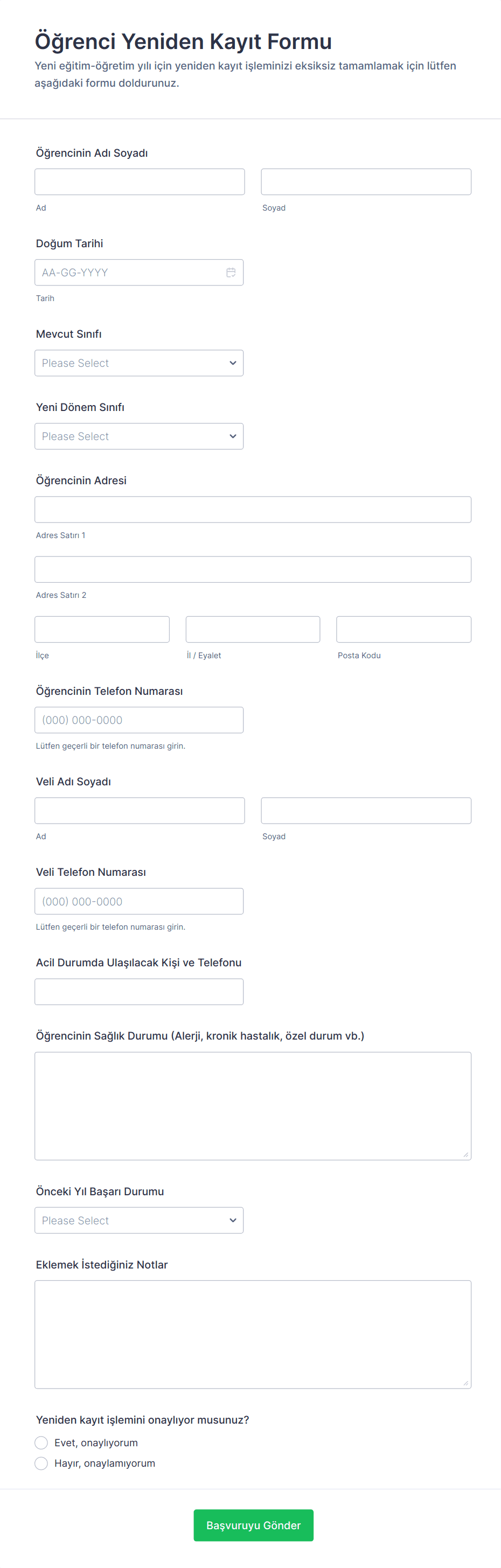 Öğrenci kayıt formları, eğitim kurumları, eğitim merkezleri ve müfredat dışı organizasyonlar tarafından öğrenci bilgilerini verimli bir şekilde toplamak ve yönetmek için kullanılan temel araçlardır. Bu formlar, öğrenciler ve kurum arasındaki ilk temas noktası olarak hizmet eder ve kişisel bilgiler, akademik geçmiş, acil durum iletişim bilgileri ve onay sözleşmeleri gibi önemli detayları toplar. Okullara yeni öğrenci kaydı, yaz kamplarına katılımcı kaydı veya atölye ve kurslara katılımcı kaydı için olsun, öğrenci kayıt formları kayıt sürecini kolaylaştırır ve gerekli tüm verilerin düzenli bir şekilde toplanmasını sağlar. Bu formların çok yönlülüğü, ilkokuldan üniversiteye, dil akademilerinden online öğrenme platformlarına kadar geniş bir eğitim ortamı yelpazesi için uygun olmalarını sağlar.