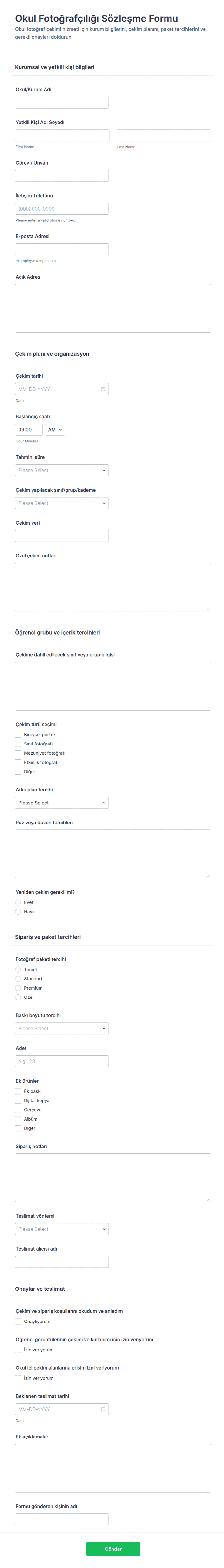 Fotoğraf formu şablonu, fotoğrafçıların rezervasyonlar, model izinleri, siparişler, geribildirimler ve daha fazlası için bilgi toplamasına yardımcı olan, idari görevleri kolaylaştıran önceden tasarlanmış bir online formdur.