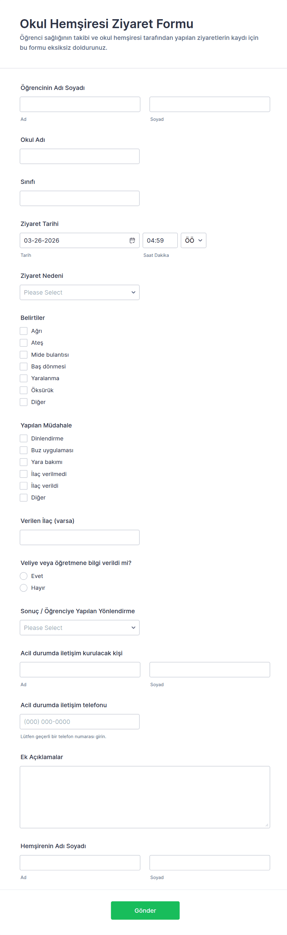 Kesinlikle. Hemşire formları hastanelerin, kliniklerin, okulların, evde sağlık hizmetlerinin ve özel uygulamaların benzersiz ihtiyaçlarına göre, gerektiğinde alanlar eklenip çıkarılarak özelleştirilebilir.
