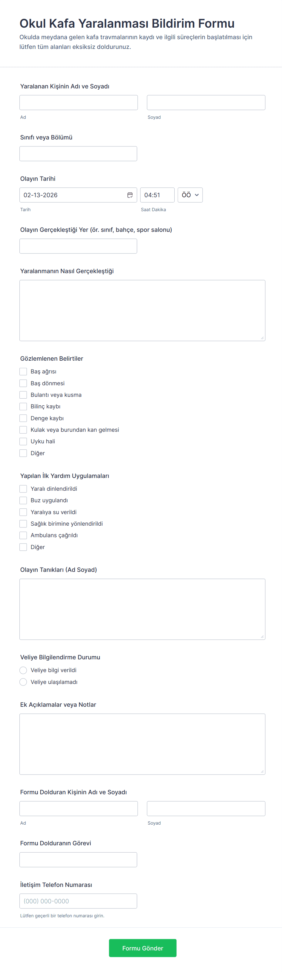 Genellikle, olaya tanık olan veya olaya karışan kişi, çoğunlukla bir yönetici, güvenlik görevlisi veya görevlendirilmiş personel desteğiyle formu doldurmalıdır.