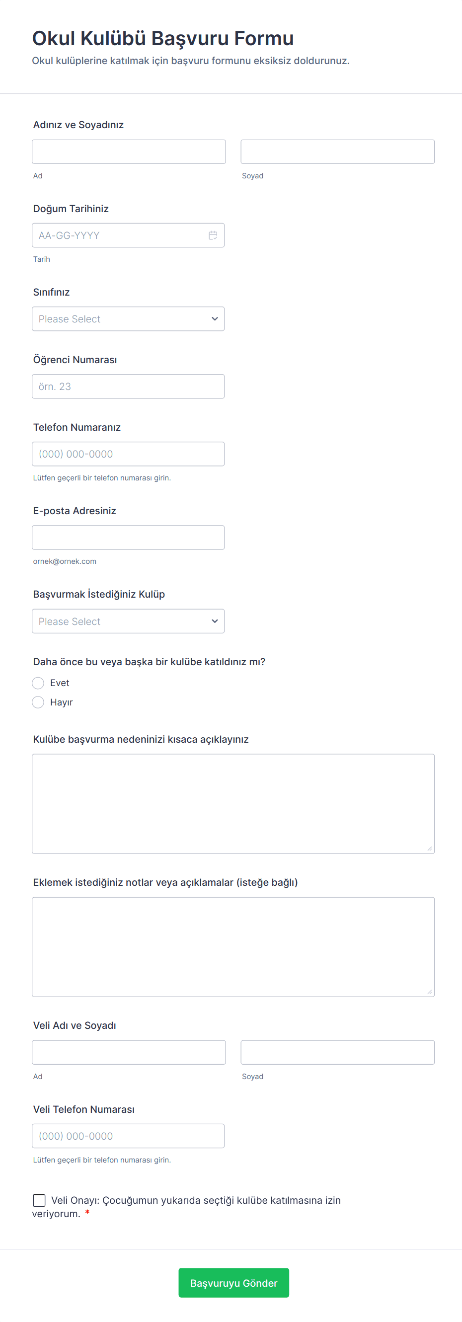 - Kulüp veya Etkinlik Kaydı: Öğrenci adı, sınıf düzeyi, veli izni ve belirli etkinlik seçimlerine odaklanır